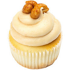 Vanilla cupcake filed with grape jelly and topped with peanut butter frosting and honey roasted peanuts.
