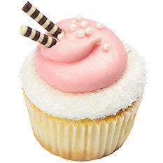 Vanilla cupcake filled and topped with strawberry buttercream, and finished with sparkling sugar, sugar pearls and chocolate straws.